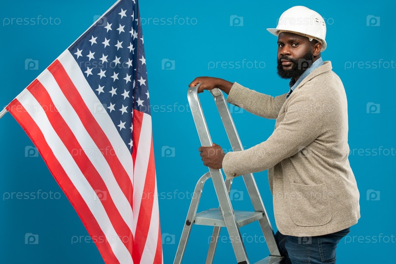 Молодой бородатый афроамериканский бригадир в защитном шлеме и формальной одежде