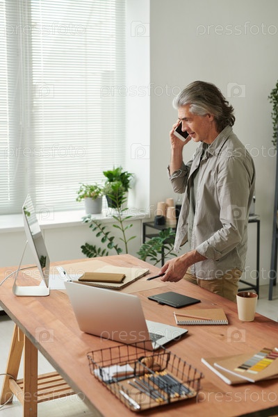 Уверенный в себе зрелый дизайнер с седой прической стоит за столом и разговаривает по телефону, объясняя концепцию дизайна клиенту