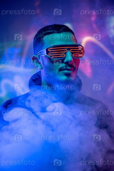 Голова современного молодого человека смешанной расы в красных спиральных очках среди дыма