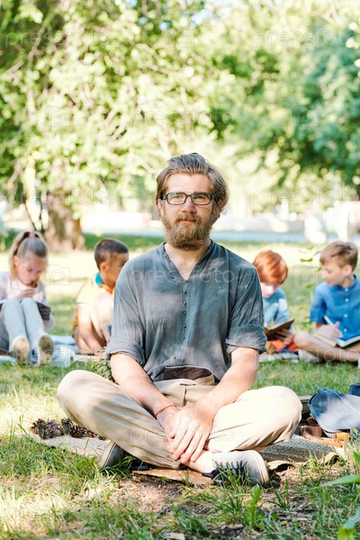Улыбающийся учитель-мужчина указывает на планету в открытом воздухе
