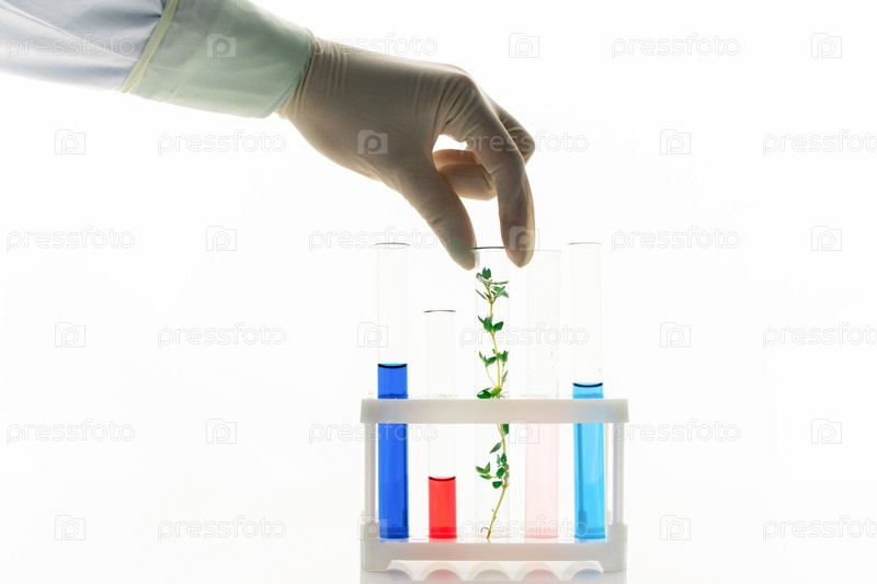Перчатковая рука биолога, помещающего флакон с растением в коробку с трубками