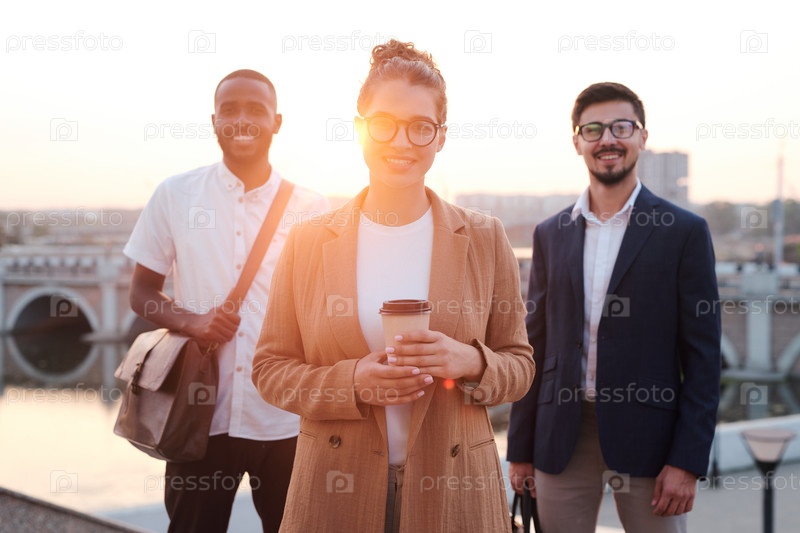 Счастливая молодая бизнес-лидерша в очках и формальной одежде, держащая кофе