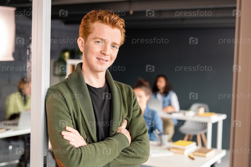 Молодой бизнесмен с перекрещенными руками в повседневной одежде стоит у открытой двери офиса