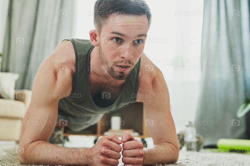 Молодой человек в спортивной одежде, стоящий на доске во время упражнений на полу