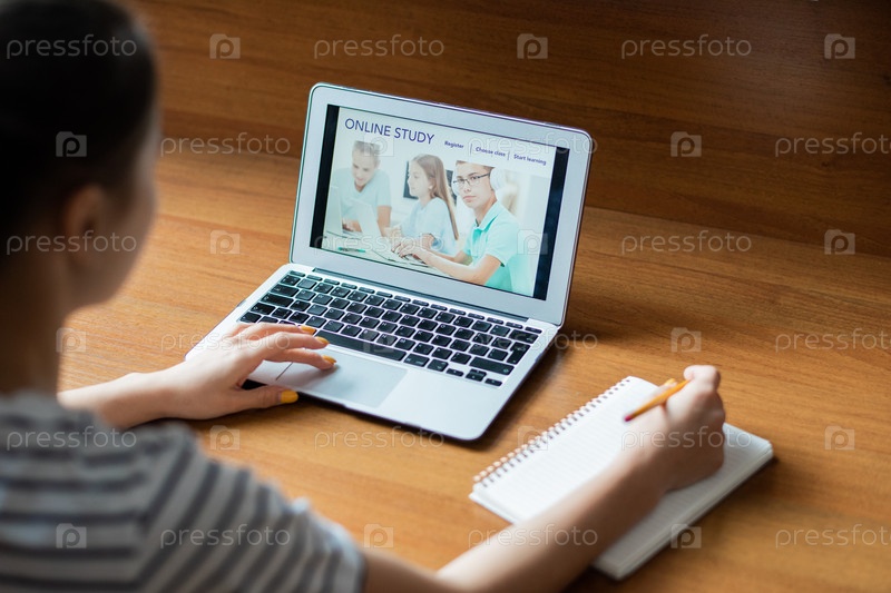 Девушка-подросток входит на образовательный сайт, прокручивая домашнюю страницу