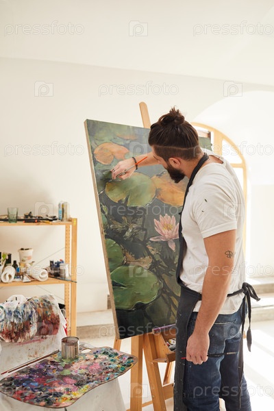 Бородатый мужчина рисует на лодке в современной студии