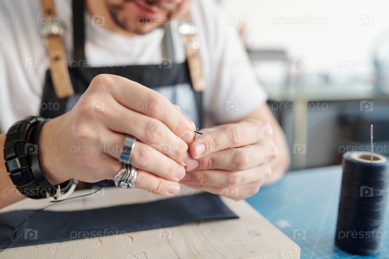 Молодой ремесленник ставит черную нить в игольное отверстие над деревянной доской