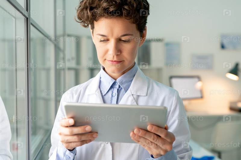 Молодой серьезный ученый или химик в белом халате, просматривающий информацию