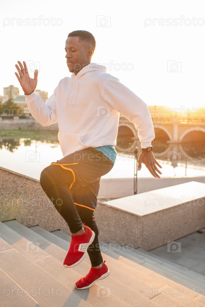 Экстатический спортсмен африканской этнической принадлежности прыгает с верхней ступени лестницы