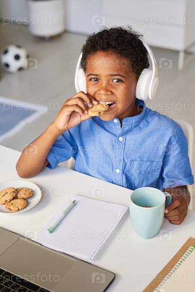 Портрет позитивного чернокожего школьника в беспроводных наушниках на обеденном перерыве во время выполнения домашних заданий