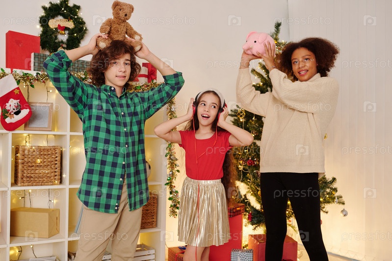 Друзья позируют с рождественскими подарками