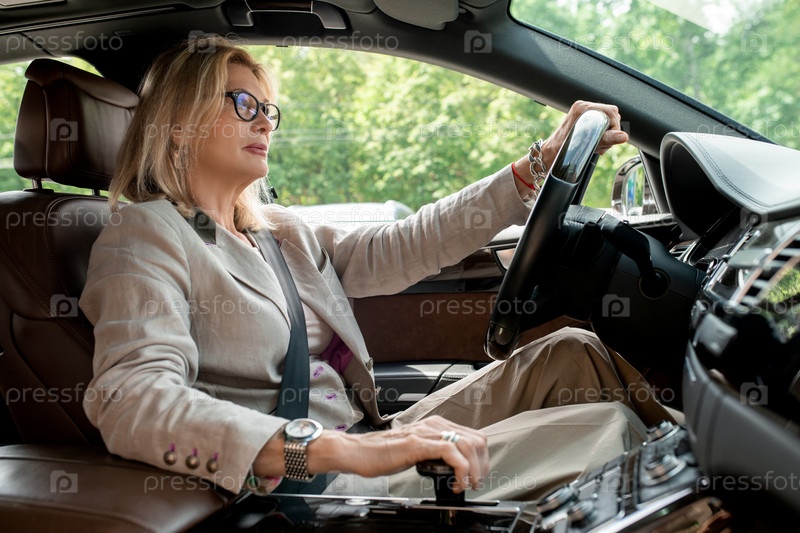 Деловая женщина сидит у открытого окна в машине и едет на встречу в офис