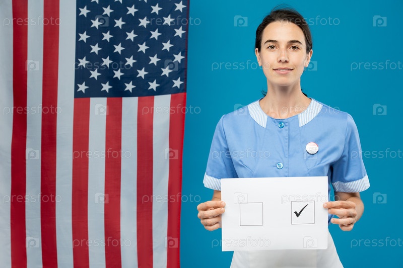 Молодая брюнетка-служанка в синей форме показывает вам свой бюллетень