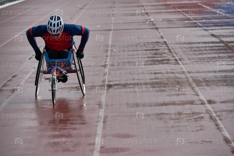 Сильно волевой, физически отсталый спортсмен-мужчина тренирует скорость в гоночном кресле