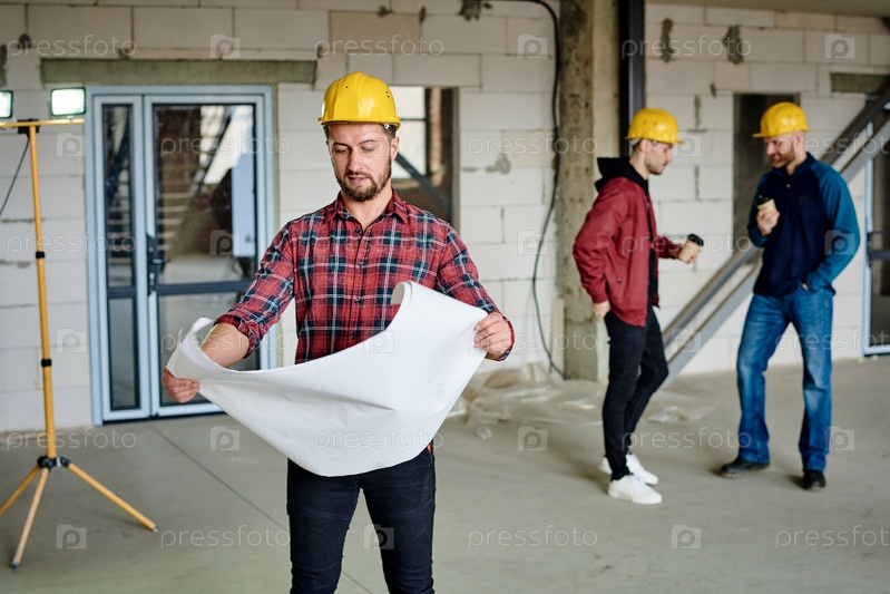 Молодой строитель в жесткой шляпе и повседневной одежде смотрит на эскиз в чертеже