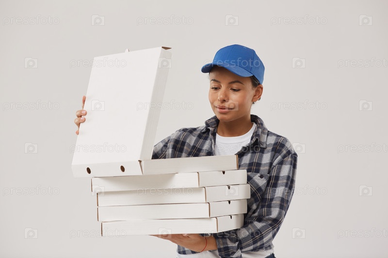 Смешанная раса молодая женщина доставляет пиццу