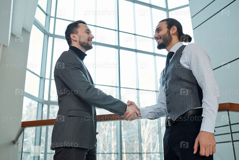 Два молодых успешных бизнес-партнера приветствуют друг друга рукопожатием