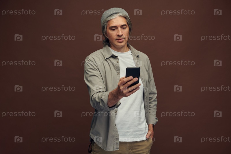 Серьезный зрелый мужчина в шапке с капюшоном проверяет мессенджеры на смартфоне или прокручивает социальные сети, коричневый фон