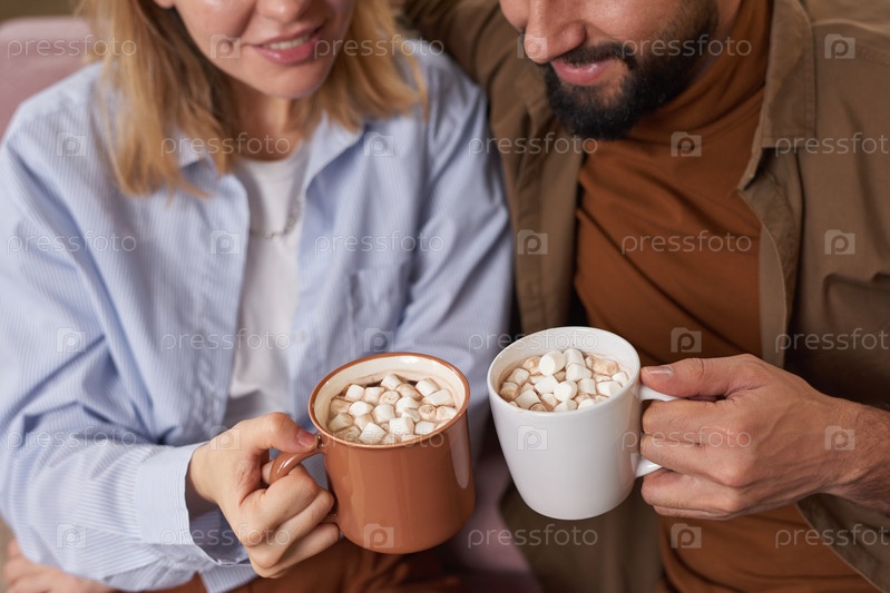 Современный молодой человек и влюбленная женщина сидят вместе на диване, держа чашки горячего кофе с зефиром