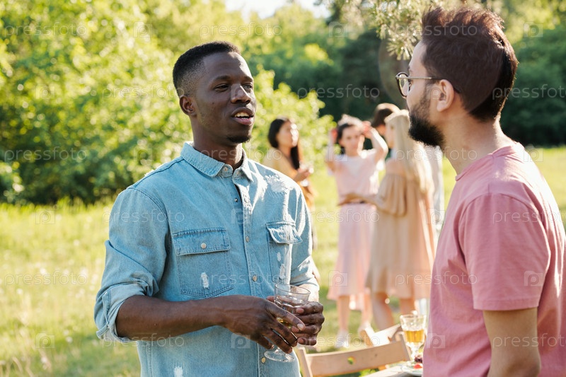 Молодой африканский мужчина со стаканом вина разговаривает с мужиком смешанной расы на улице