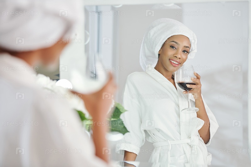 Женщина пьет вино после душа