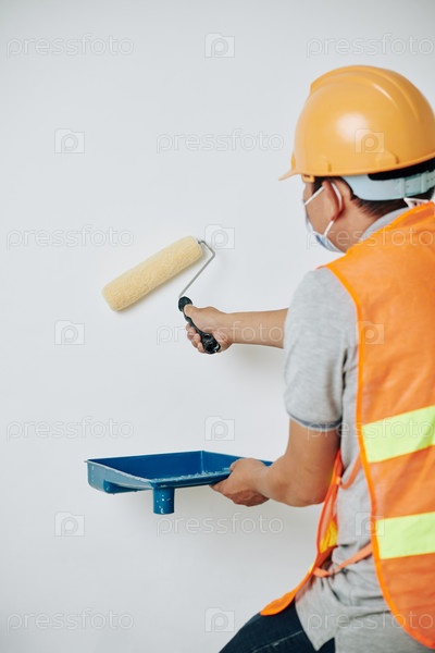 Рабочий красит стены белым