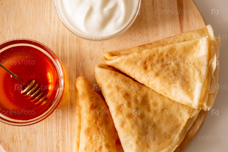 Обзор свежих сложенных блинов, кислой смеси и меда на деревянной доске
