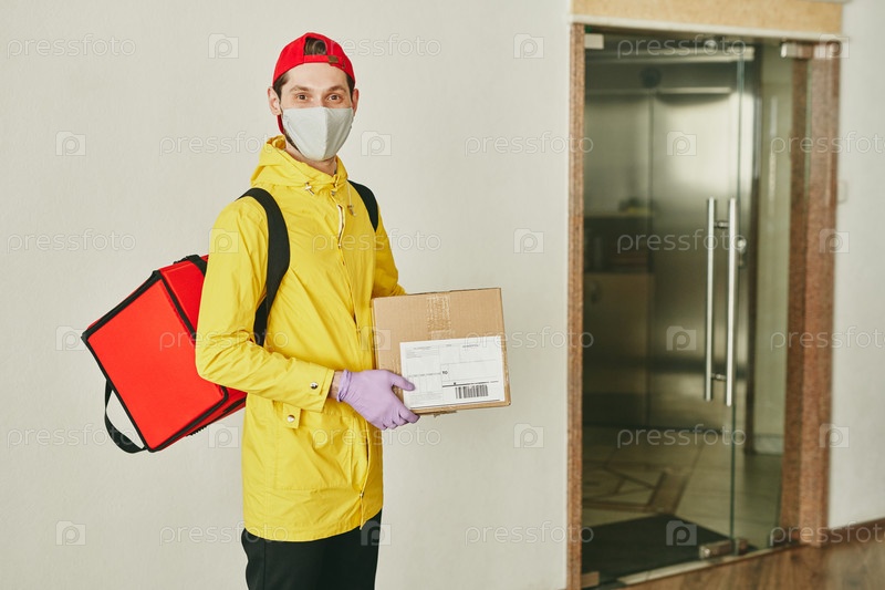 Счастливый молодой курьер с большим красным рюкзаком и картонной коробкой в руках