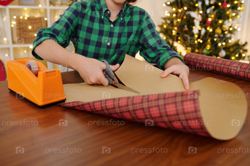 Подросток режет оберточную бумагу