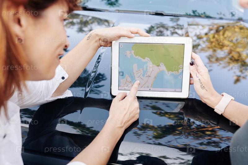 Друзья обсуждают карту на планшетном компьютере