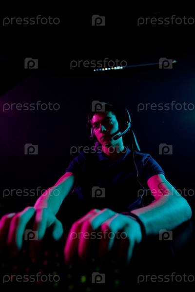 Молодой серьезный оператор колл-центра, печатающий на компьютерной клавиатуре