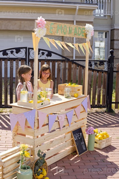 Две милые девочки продают домашний лимонад у деревянного киоска в летний день