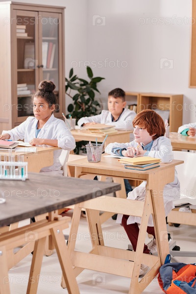 Группа детей начальной школы в белых халатах, сидящих у столов в два ряда