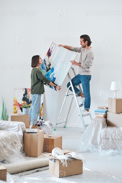 Молодой человек стоит на лестнице, пока его жена помогает ему повесить картину