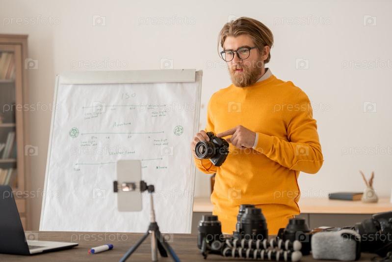 Современный молодой профессиональный фотограф, разговаривающий с онлайн-аудиторией