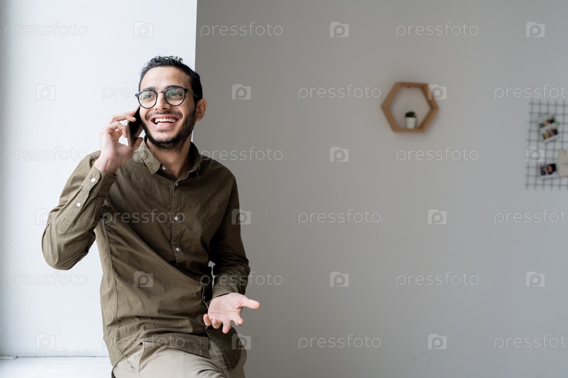 Счастливый молодой агент или менеджер со смартфоном, звонящий одному из клиентов