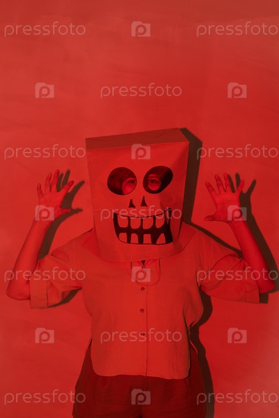 Портрет ужасающей женщины в маске из бумажного мешка на Хэллоуин, которая жестикулирует руками и пугает вас в красной темной комнате