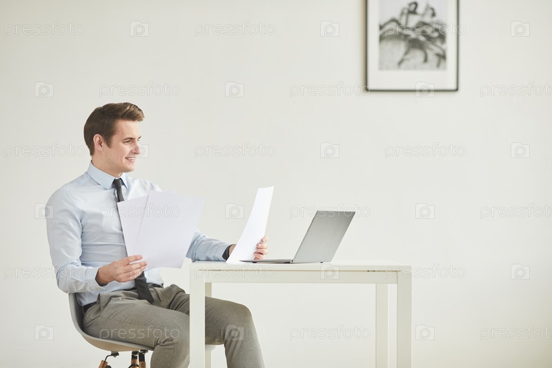 Минимальный портрет улыбающегося бизнесмена за рабочим столом