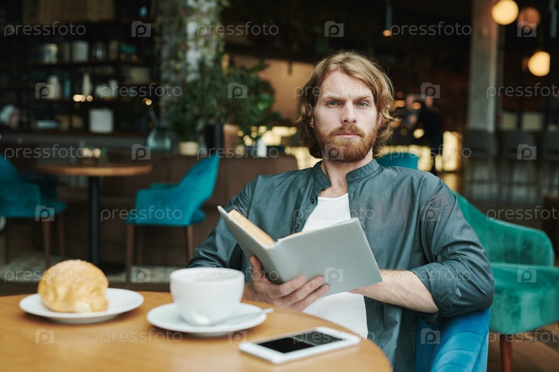 Уверенный молодой человек в обычной рубашке сидит на кресле и отворачивается, разговаривая по телефону в современном кафе