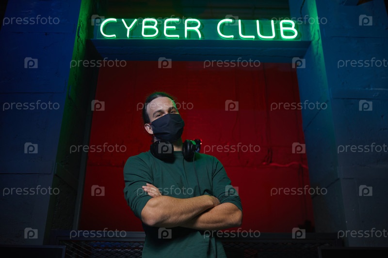 Геймер в маске в компьютерном клубе