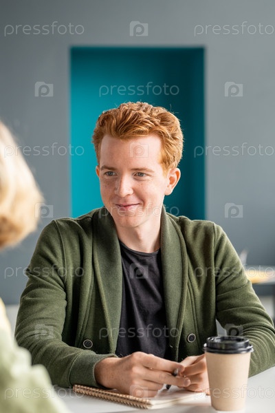 Счастливый молодой бизнесмен в повседневной одежде смотрит на коллегу и слушает ее