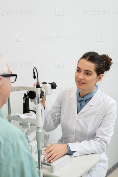 Молодая красивая женщина-офтальмолог в белом халате, работающая с медицинским оборудованием