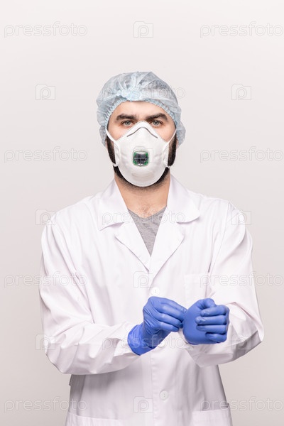 Молодой хирург надевает защитные медицинские перчатки на руки перед операцией