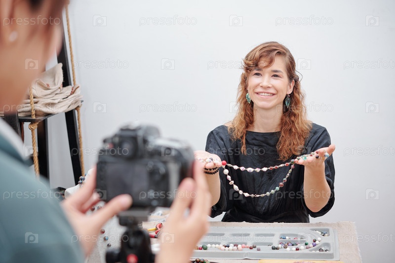 Женщина позирует с ожерельем из натурального камня
