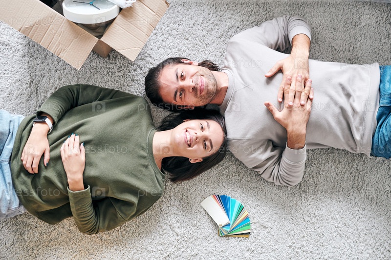 Обзор современной веселой молодой пары в повседневной одежде, лежащей на полу