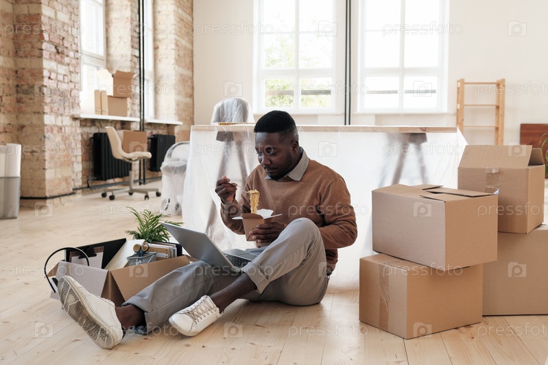Молодой афроамериканский мужчина сидит среди картонных коробок и использует ноутбук, едя лапшу в новом офисе после переезда