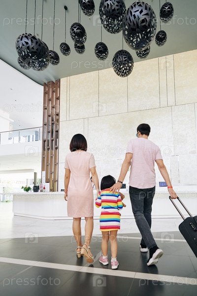 Семья идет пешком к рецепции отеля
