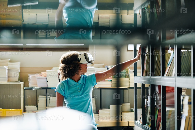 Девушка в очках VR ходит по библиотеке