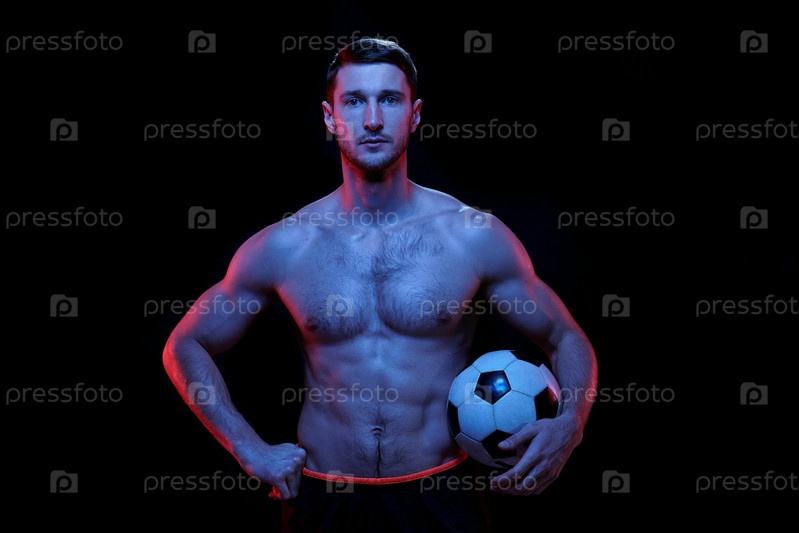 Молодой серьезный футболщик без рубашки с футбольным мячом, стоящий в изоляции