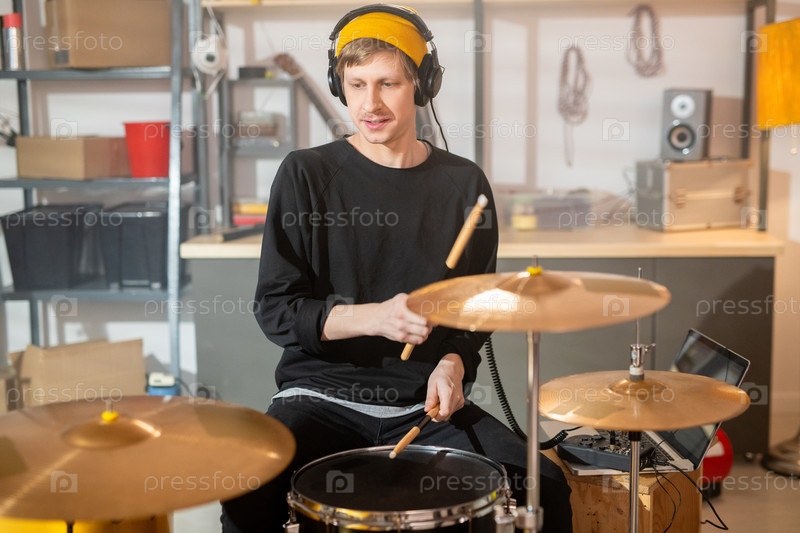Молодой человек в наушниках и повседневной одежде бьет барабан с палками